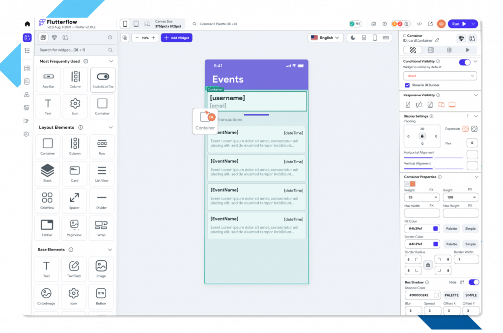 Interface de Flutter Flow avec éléments disponibles en drag-and-drop