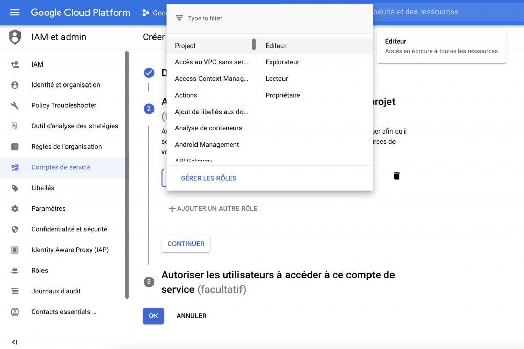 3 – Durant l’étape 1, complétez les Détails du compte de service et cliquez sur Créer. Le nom du compte de service vous permettra de l’identifier parmi les autres déjà créés.
