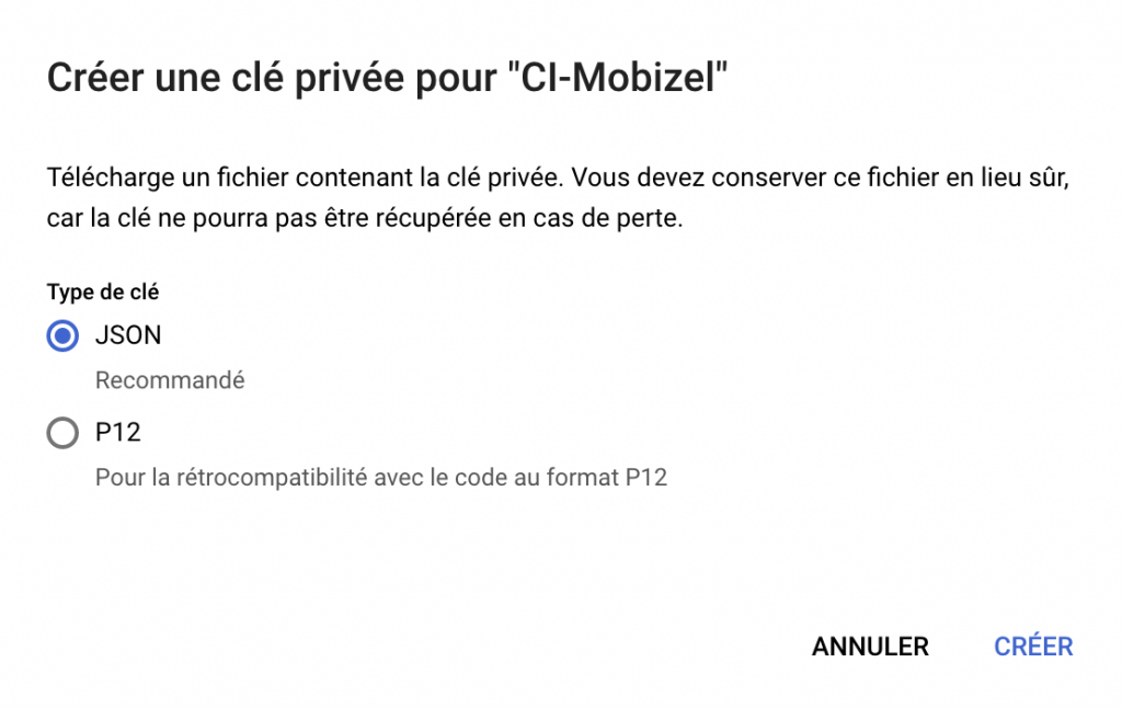 5 – Définissez le format sur JSON, et cliquez sur Créer. Sauvegardez le fichier dans un endroit où vous allez pouvoir le retrouver aisément.