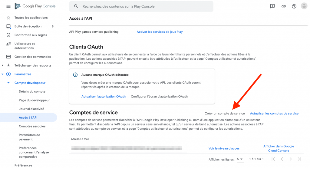 1 – Dans la console Google Play, naviguez jusqu’à Paramètres > Compte développeur > Accès à l’API.