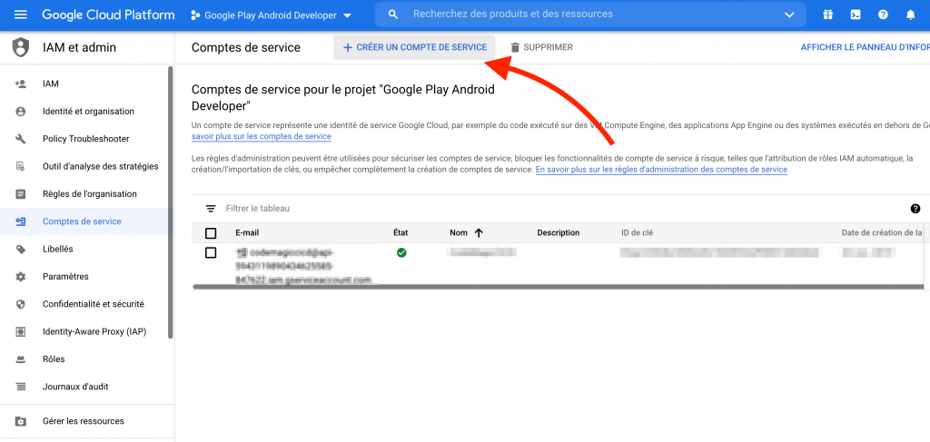 Pour permettre à un tiers de publier et configurer automatiquement votre application sur le Google Play, le créateur du compte développeur Google doit créer un compte de service.