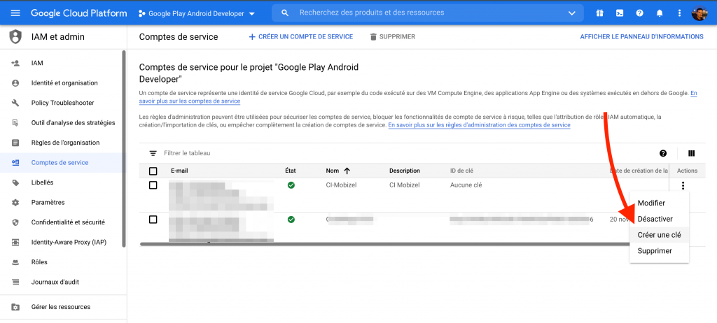 4 – Dans la liste des comptes de service affichés, identifiez celui que vous venez de créer et cliquez sur le menu d’actions en bout de ligne puis choisissez Créer une clé.
