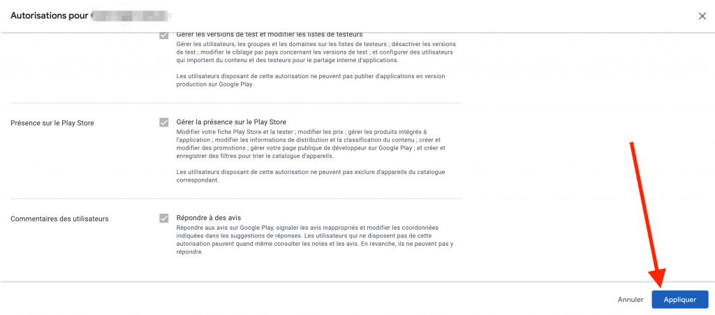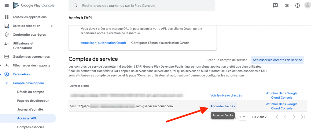6 – Retournez dans la Google Play Console Paramètres > Compte développeur > Accès à l’API, et cliquez sur Accorder l’accès à côté du compte nouvellement créé.