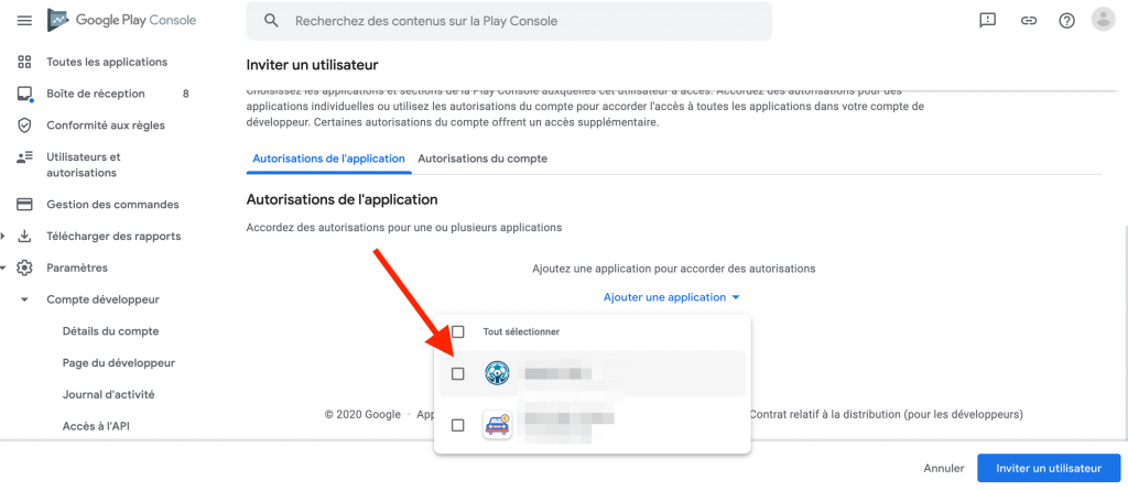 7 – Dans l’onglet Autorisations de l’application, sélectionnez l’application à laquelle vous souhaitez accorder l’accès pour ce compte.