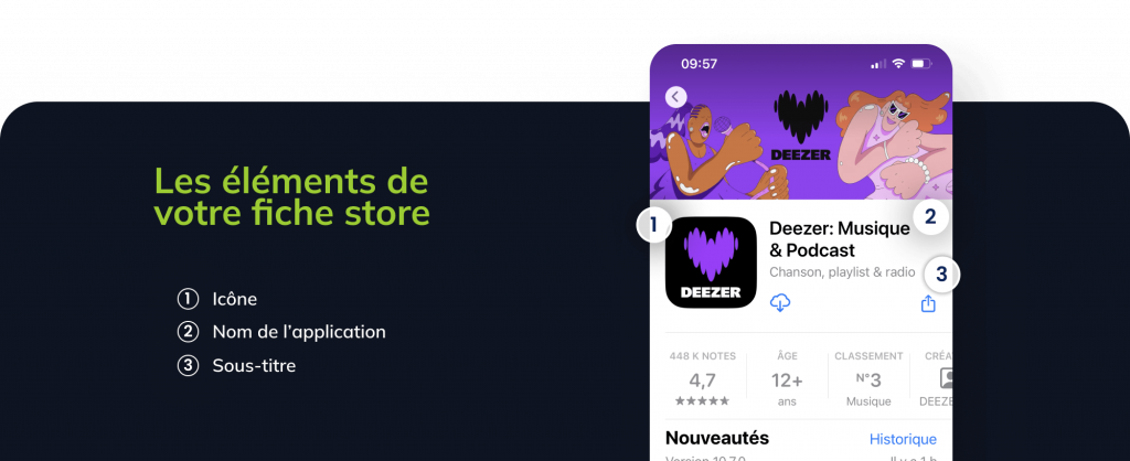 Le sous-titre d’une application mobile est une opportunité supplémentaire de capturer l’attention des utilisateurs et de leur fournir des informations complémentaires sur votre application. Profitez-en pour mettre en avant les fonctionnalités principales ou les avantages distinctifs de votre application.