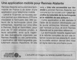 Mobizel, qui a permis la réalisation de l’application de Rennes Atalante, 1ère technopole française à se munir d’une application mobile, est cité dans l’article de l’édition de Ouest-France du 17 janvier 2011.