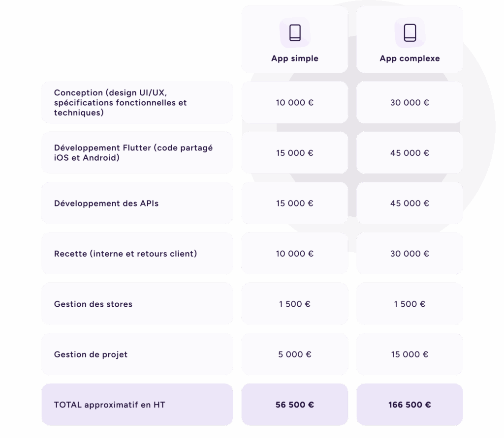 Le budget d’une application mobile sur-mesure varie fortement selon le nombre de fonctionnalités, la complexité technique (ex : connexion Bluetooth, géolocalisation, offline, API externes…), les plateformes visées (iOS et Android avec Flutter), l’intégration de l’app mobile à votre SI, la structure des API et de vos données ou encore le design et l’expérience utilisateur attendus.