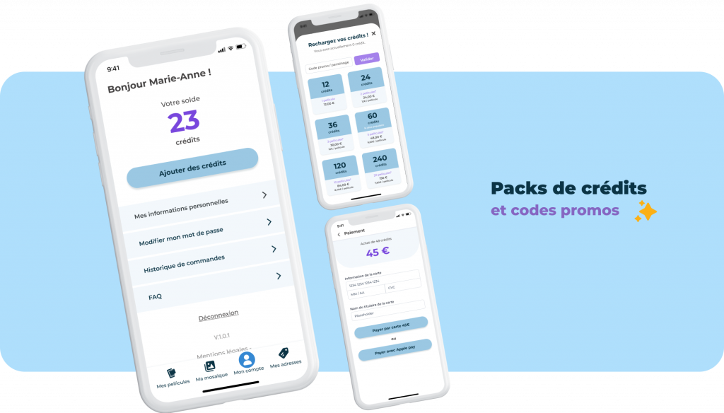 Les clients achètent des packs de crédits à utiliser quand ils le souhaitent. Ils ont la possibilité de saisir des codes promo dans l’application pour bénéficier de tarifs préférentiels sur les packs.